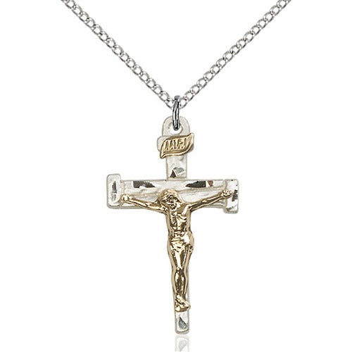 The Two-Tone GF/SS Nail Crucifix Pendant features a unique design, hand-made in the U.S.A. This 1 1/8 x 5/8-inch pendant comes on an 18" sterling silver lite curb chain with a secure clasp. With a guarantee against tarnishing, it combines elegance and durability, making it a timeless addition to any jewelry collection.