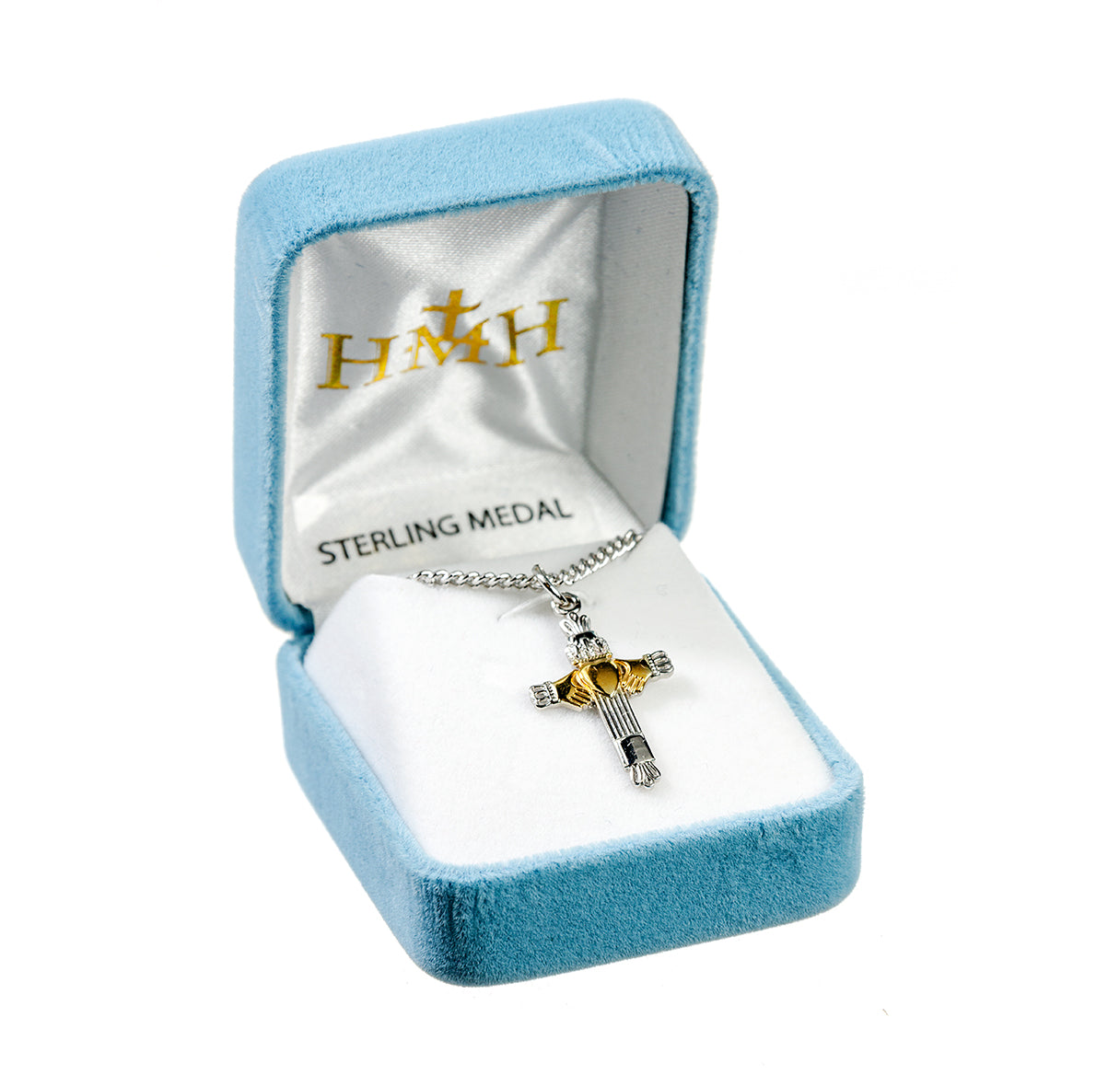 The Irish Claddagh ring is an enduring symbol of love, loyalty, and friendship. In this unique necklace, the hands and heart of the Claddagh form part of the cross. The gold plated hands and heart add a luminous contrast, and highlight Jesus' wholehearted love for you. A thoughtful gift for your favorite Irish friend, or a gift of friendship for the Irish at heart. Gift boxed for presentation.