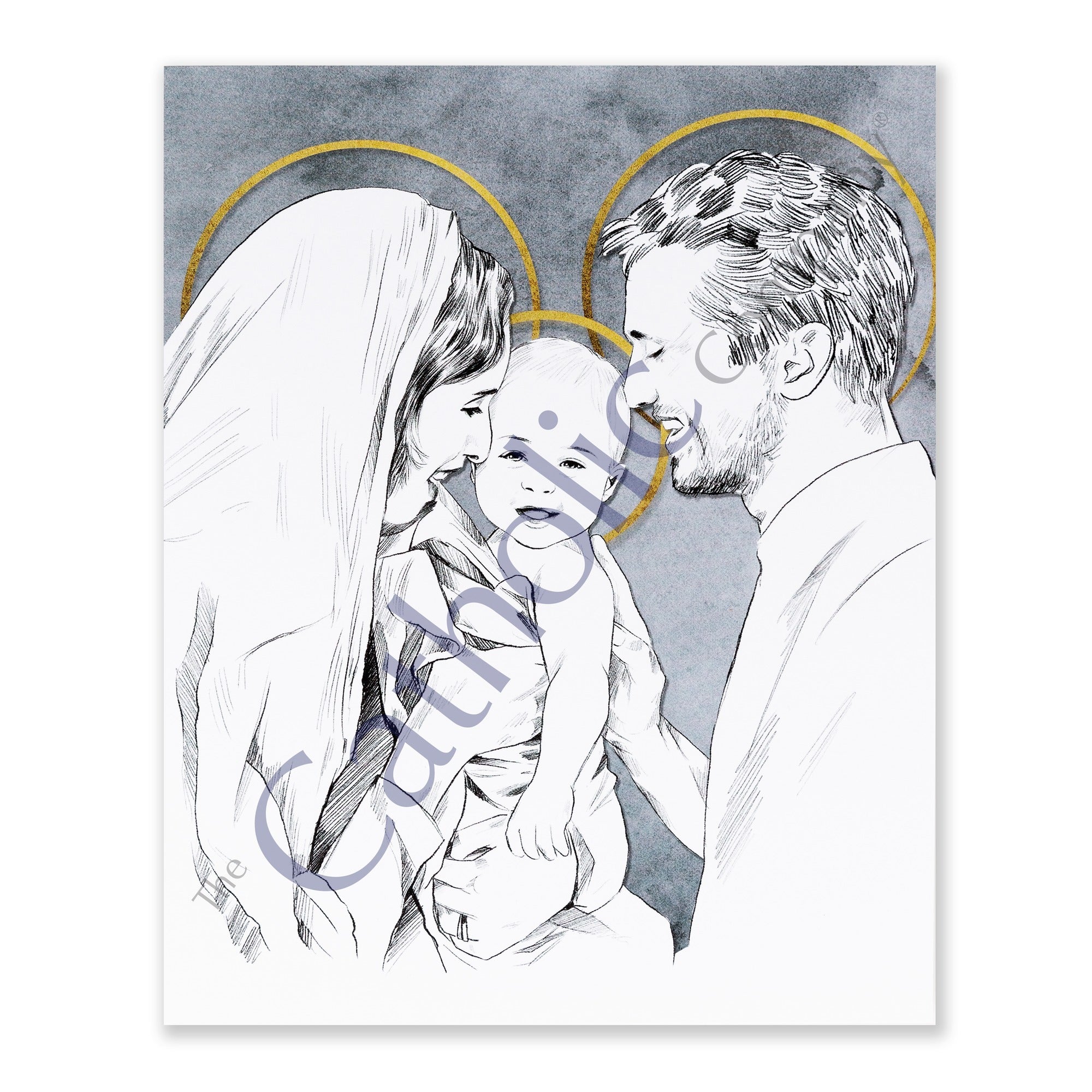 Display this unframed print of the Holy Family in your kitchen, bedroom, or office, and be reminded of the love of our Blessed Mother, St. Joseph, and Jesus, and their intimacy as a family. This beautiful pen and ink style drawing in white, black, gray and gold is neutral, simple, and beautiful. A precious gift idea for any Christian family, parents, or grandparents. A perfect pregnancy gift, baby shower gift, or wedding gift.