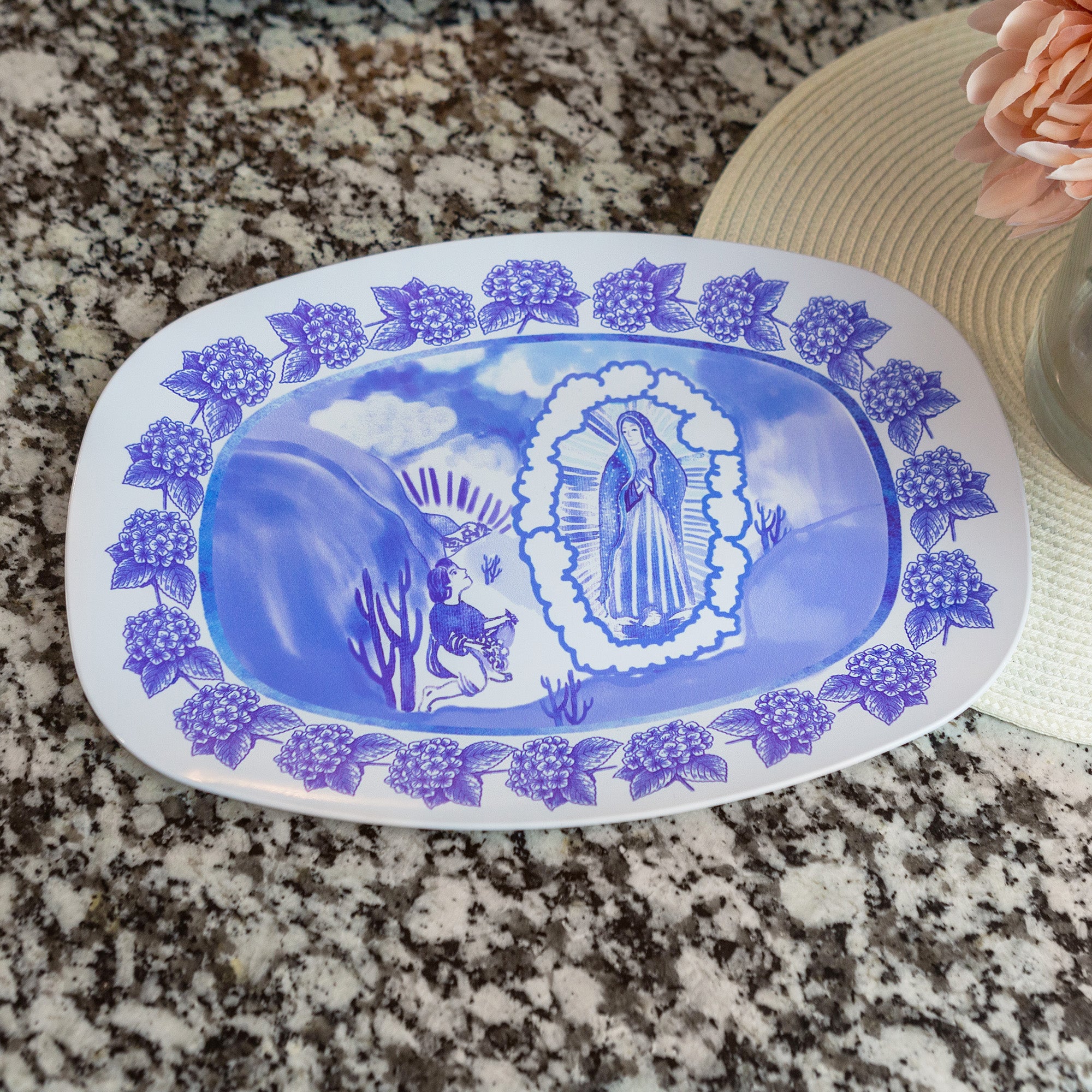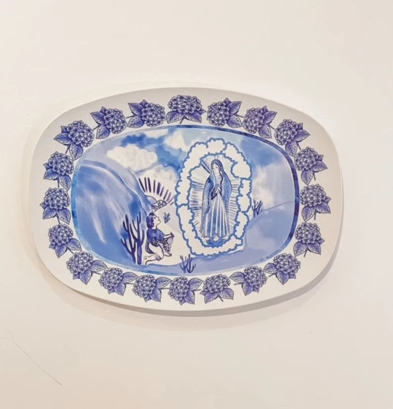 Celebrate Our Lady of Guadalupe with this exquisite handmade platter, showcasing blue and white hand-painted designs reminiscent of chintzware. Depicting Mary and St. Juan Diego, this unbreakable, fade-resistant dinnerware honors Mary's Feast Days while being dishwasher, microwave, and oven safe. Perfect for family gatherings, it's crafted in the USA without BPAs or harmful chemicals.