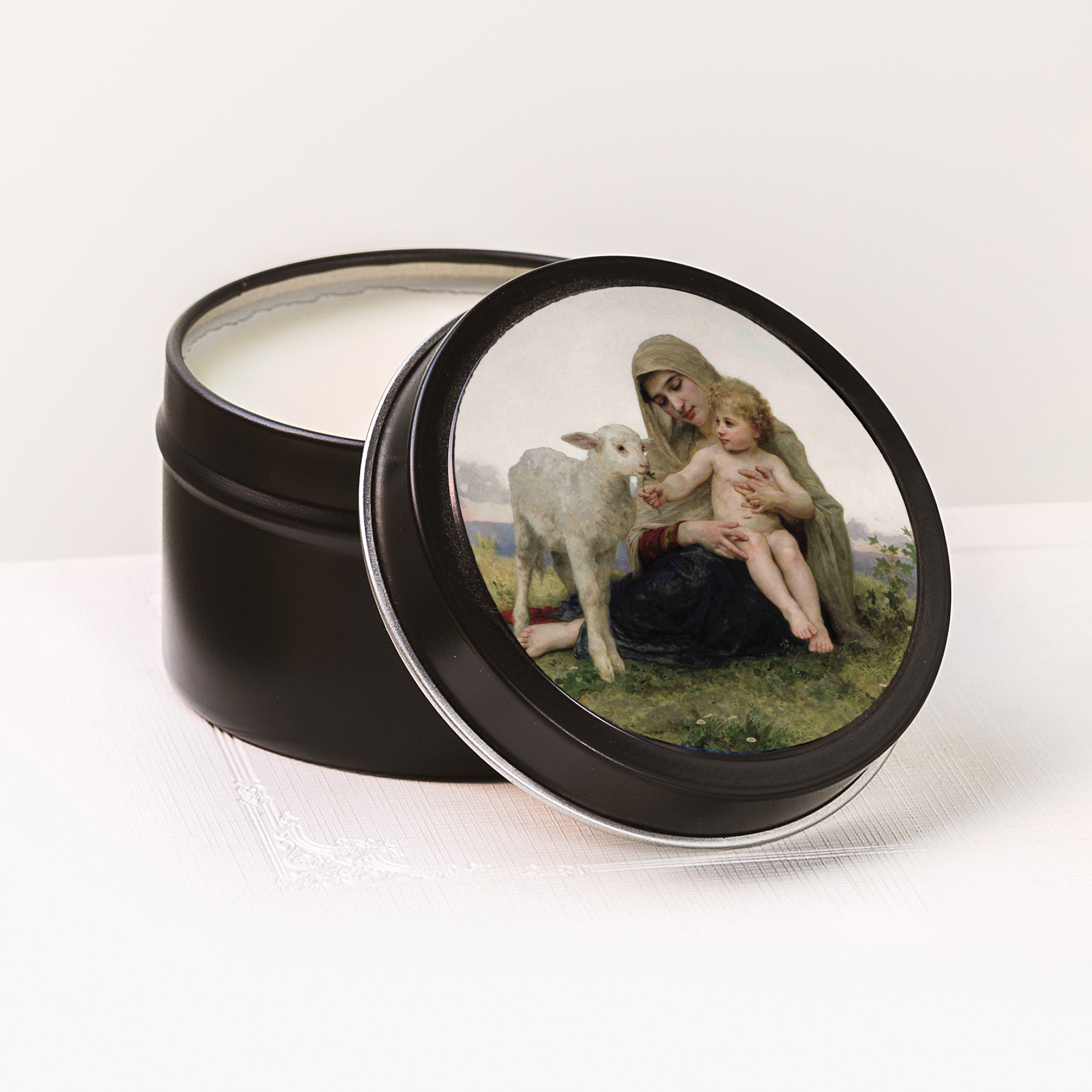 Featuring a matte black tin with elegant artwork by William Bouguereau on the lid known as Virgin & the Lamb, it's the perfect gift for a traveler or someone dear, and a portable delight to take on a journey, but it will bring peace and grace wherever you enjoy it.