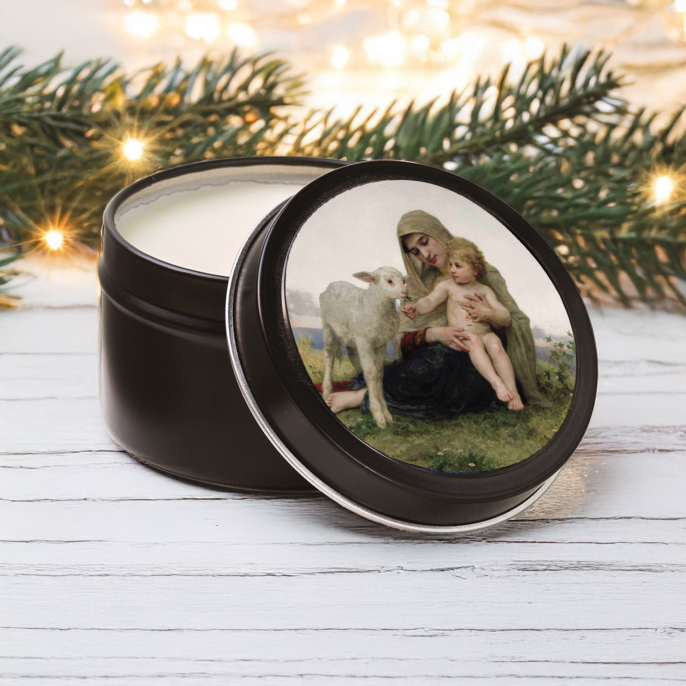 The Virgin & the Lamb Candle Tin from The Catholic Company features elegant artwork by William Bouguereau on a matte black tin. This 6 oz. soy coconut wax candle, with its invigorating Christmas tree scent, is perfect for prayer, relaxation, or as a thoughtful gift. Ideal for home décor or travel, it brings peace and grace, honoring the Madonna and Child in a portable design.