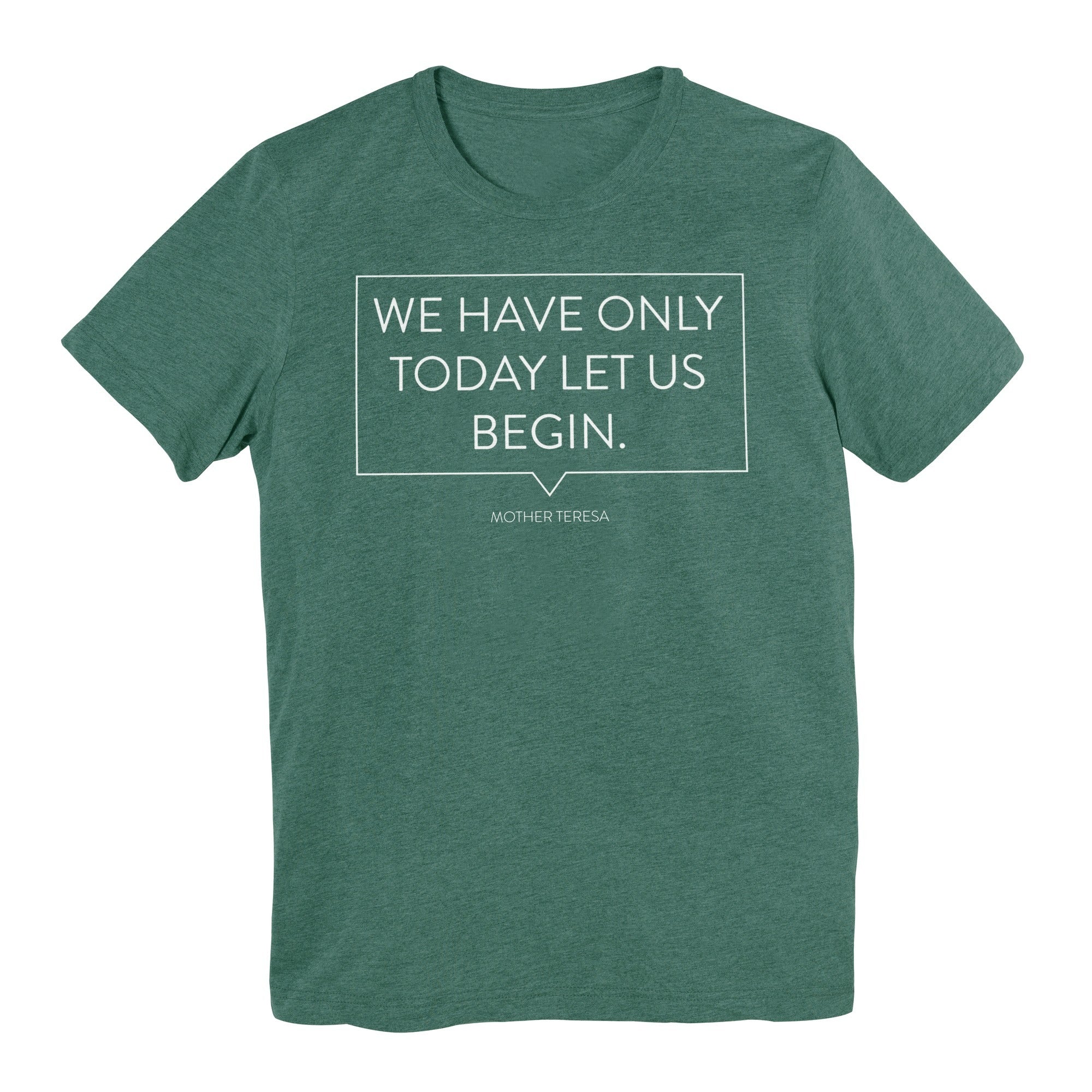Embrace every moment with the "We Have Only Today" T-Shirt, featuring an inspiring quote from St. Teresa of Calcutta. This short sleeve teal shirt, exclusively by The Catholic Company, serves as a fashionable reminder to seize the day and trust in the Lord. Made from a comfortable blend, it makes a perfect gift for a female friend.