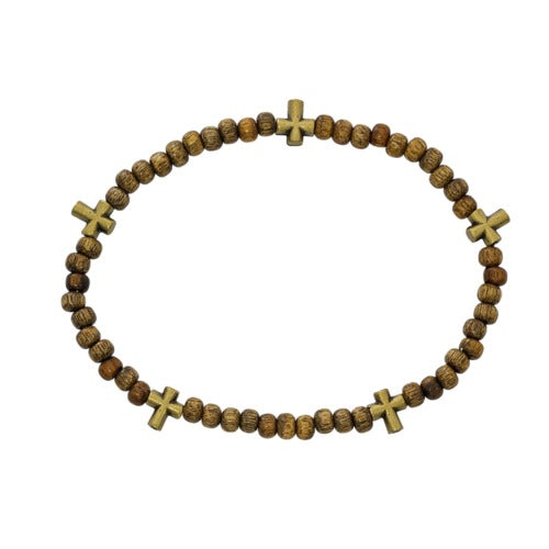 This rustic, stained wood bracelet features a full rosary, with 5 miniature decades of wooden beads separated by antique golden crosses as Our Father beads. The handsome design works for both men and women, and will be a powerful reminder to ask Our Lady for her guidance. Stretch design fits most. A subtle Marian piece for Confirmation, graduation, or another special occasion.