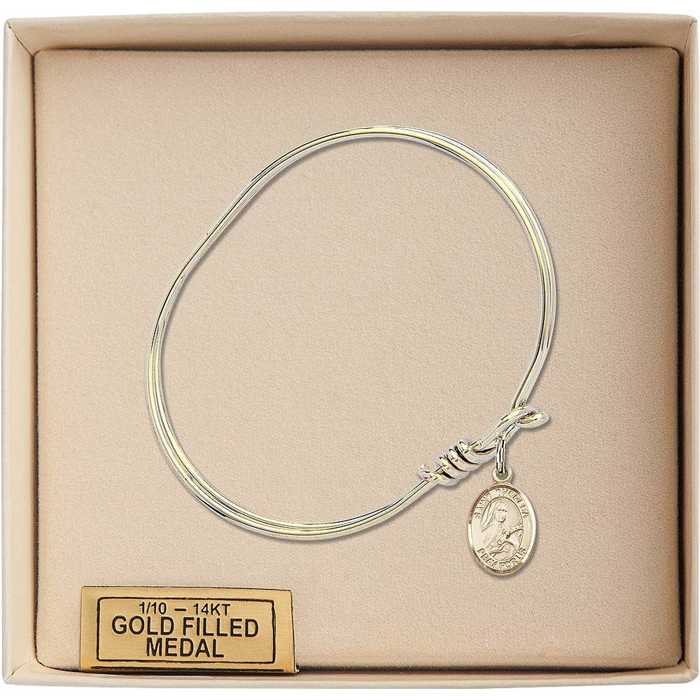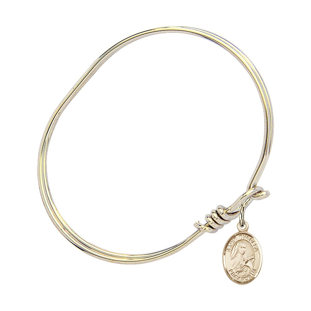 Youth 5 3/4" Oval "Hamilton Gold" Plated Bangle Bracelet with a 14kt Gold Filled St. Theresa Medal Charm. "Hamilton Gold" is a heavy gold plate designed to match the rich color of the 14 Karat Gold Filled charms.