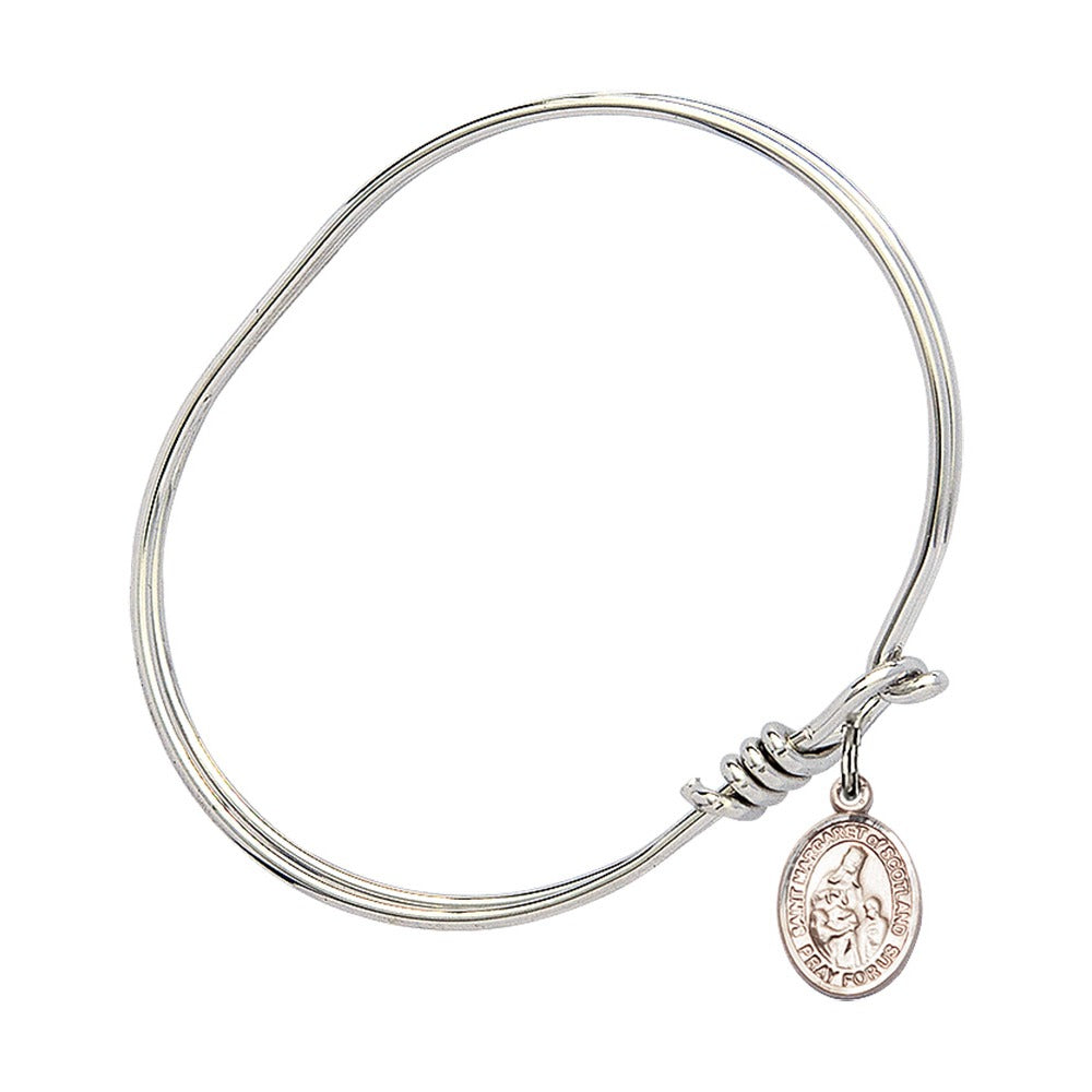Youth 5 3/4" Oval Rhodium Plated Bangle Bracelet with a Sterling Silver St. Margaret of Scotland Medal Charm.