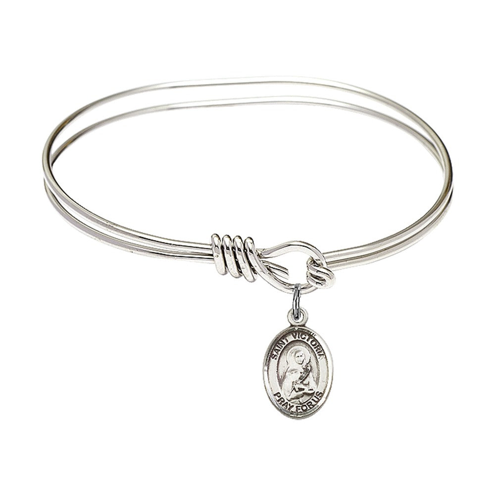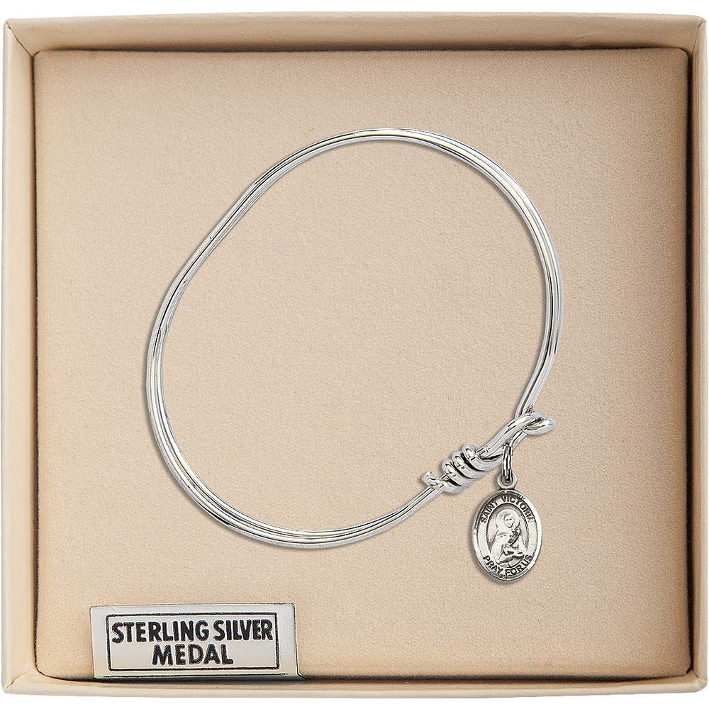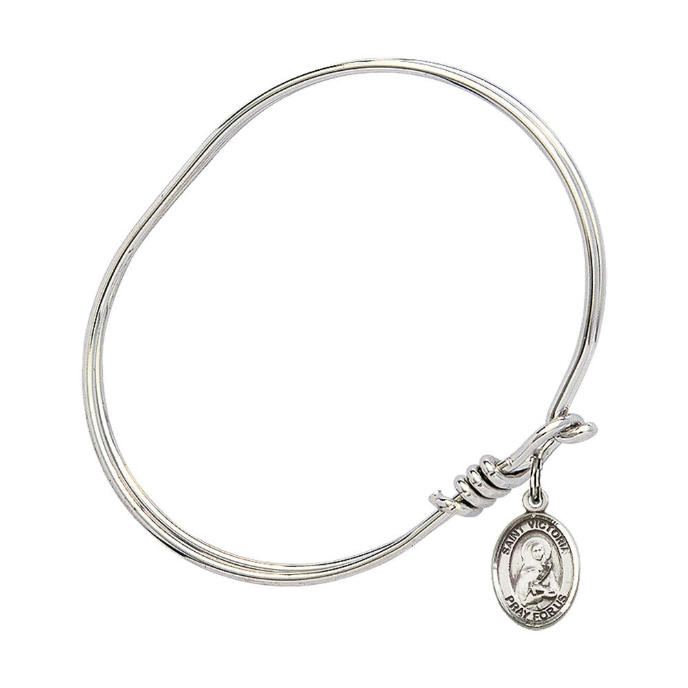 This charming 5 3/4" oval bangle bracelet is rhodium-plated to ensure it won't tarnish. It features a sterling silver St. Victoria medal charm, measuring 1/2 x 1/4 inches, adding a touch of faith and elegance. Hand-made in the USA, this bracelet makes a thoughtful gift for young individuals celebrating their spirituality.